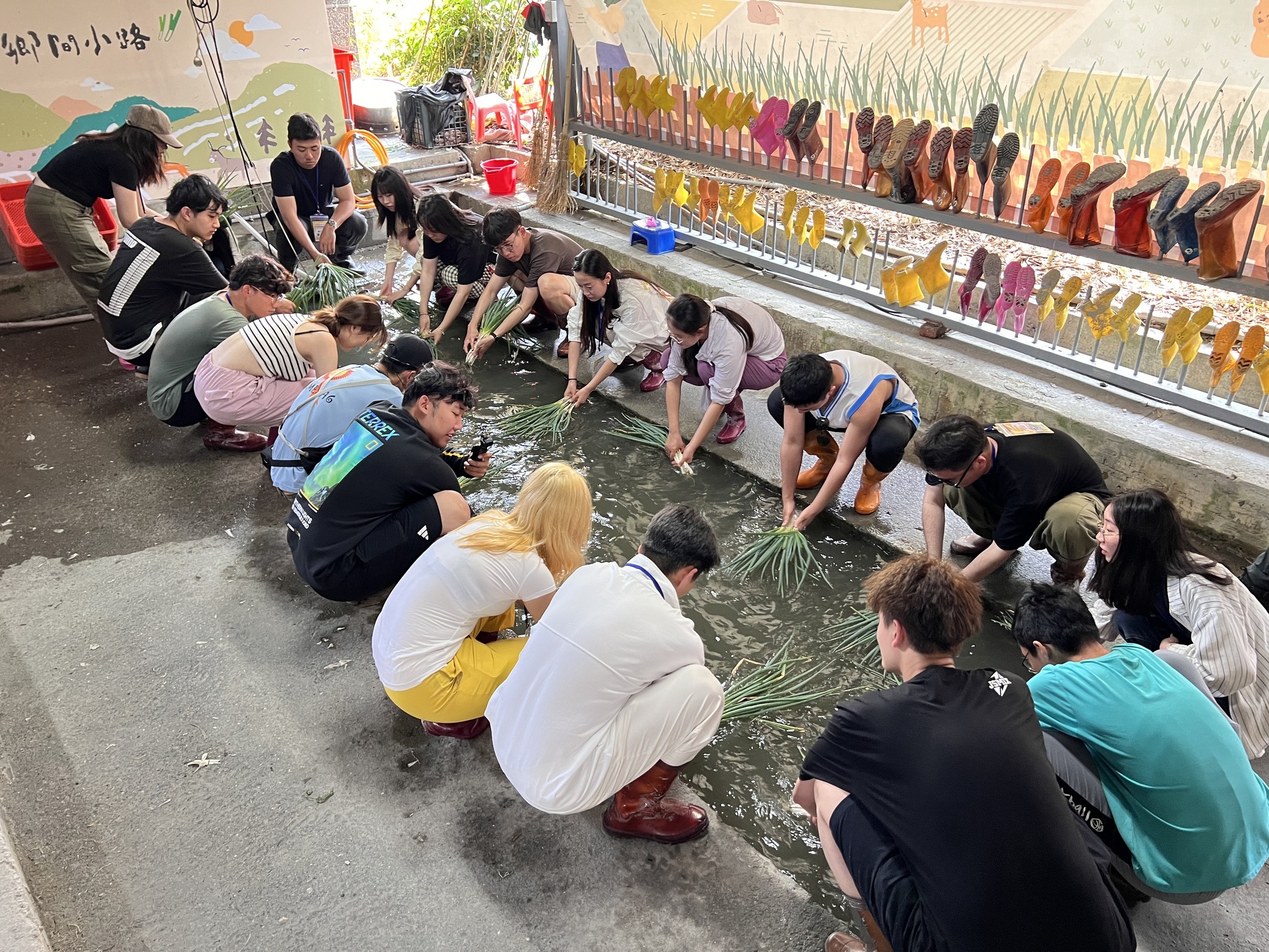 陸生在蔥寶寶體驗農場,戴上斗笠、穿上雨鞋下蔥田體驗拔蔥、洗蔥並手做蔥派,在實作中學習三星蔥相關食農知識與專屬栽培法。