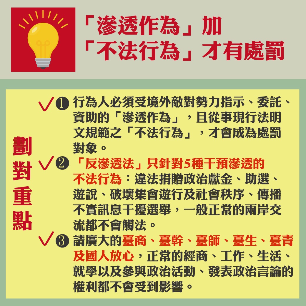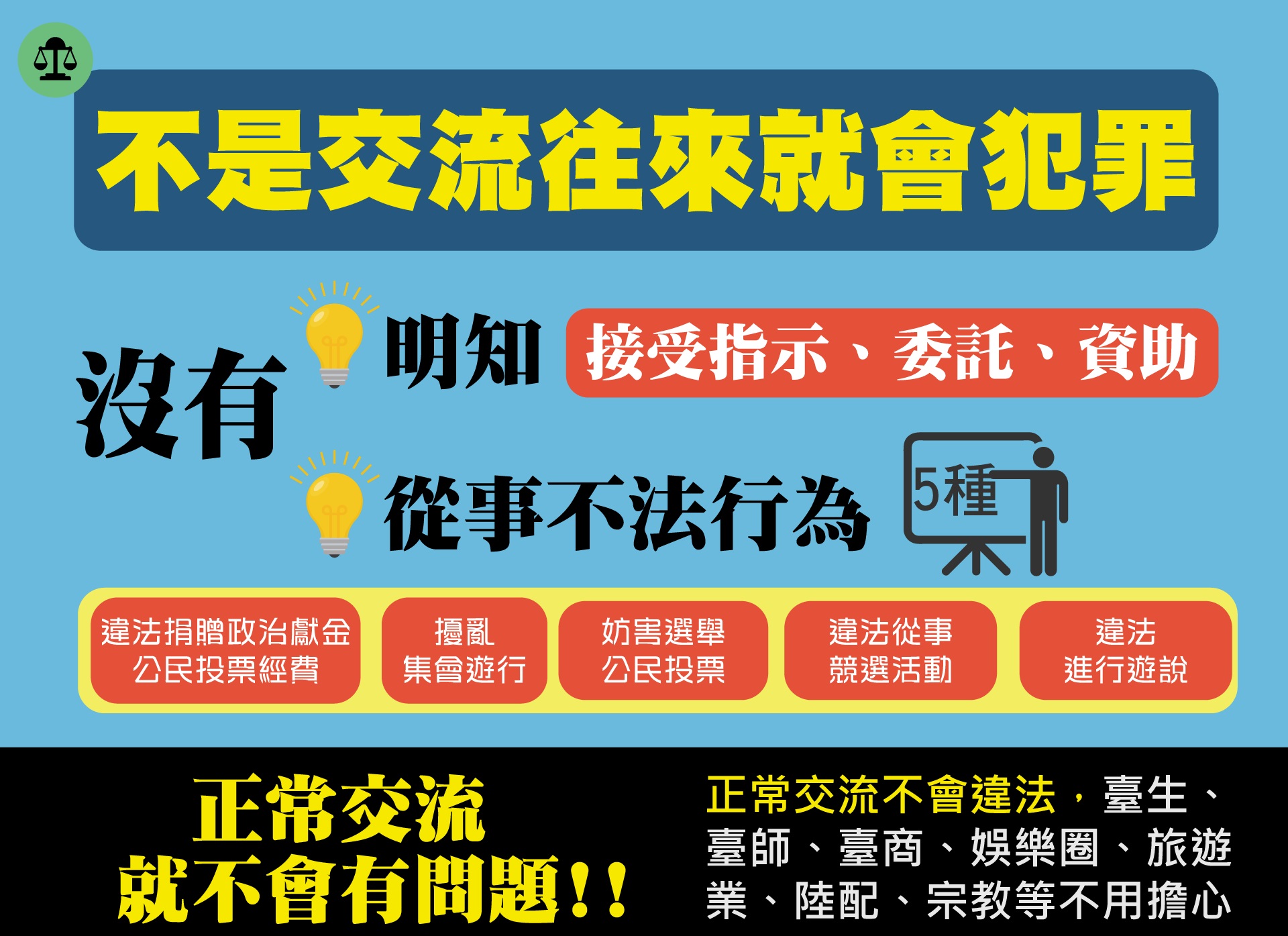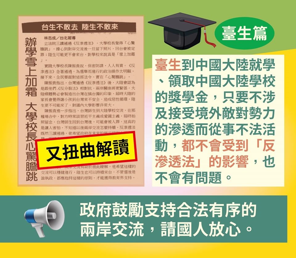 (二)臺生若因學業表現優異,獲得陸方獎學金,或是赴陸進行一般單純的交流活動,不會有任何涉及違法的問題,因並未涉及接受陸方指示、委託、資助,而有違法捐贈政治獻金、助選、遊說、破壞集會遊行及社會秩序、傳播假訊息干擾選舉等行為,並不會違反「反滲透法」規定,無需恐慌或擔心。呼籲青年朋友切勿被不實報導所刻意營造的恐懼所迷惑。