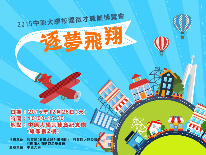 中原大學「逐夢飛翔」校園徵才就業博覽會訂於12月26日(星期六)舉行,歡迎台生、陸生踴躍參加!