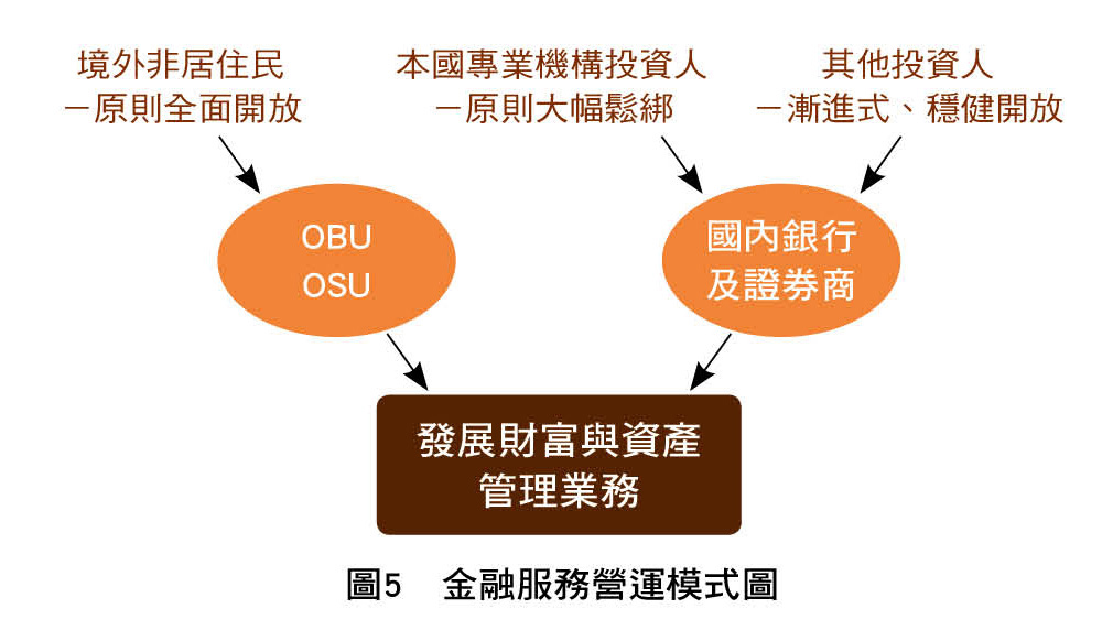 在營運模式上(如圖5),在境外非居住民為交易對象方面,原則全面開放,由OBU及OSU提供相關金融服務,擴大我國金融市場規模。在本國專業機構投資人方面,原則上大幅鬆綁,開放國內銀行及證券商得辦理業務及商品。就本國專業機構投資人以外之投資人,於兼顧產業發展與投資人保護之原則下,採漸進的方式穩健開放。