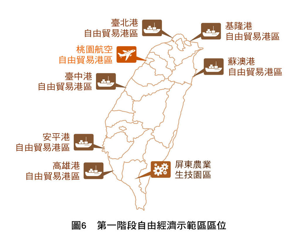 第一階段(特別條例公布前)係以現行六海一空自由貿易港區,以及屏東農業生物科技園區共8處先行推動(圖6),並透過「境內關外」及前店後廠委外加工模式,結合鄰近園區,在北、中、南地區自然形成聚落。此外,中央產業主管機關如有新設區位需求,經報請行政院核定後,即可於第一階段新設示範區。