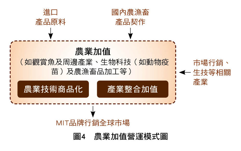 農業加值的意涵,係將農業從「農產品」擴大為「農業價值鏈」,善用國內農業技術,致力進行產品的創新加值,並結合MIT行銷國際。營運模式(如圖4)是引進國內外資金及原物料,透過國內技術、人才與產業管理進行技術商品化、加工等農業加值活動,以生產優質、具創意及競爭力之台灣農業產品。