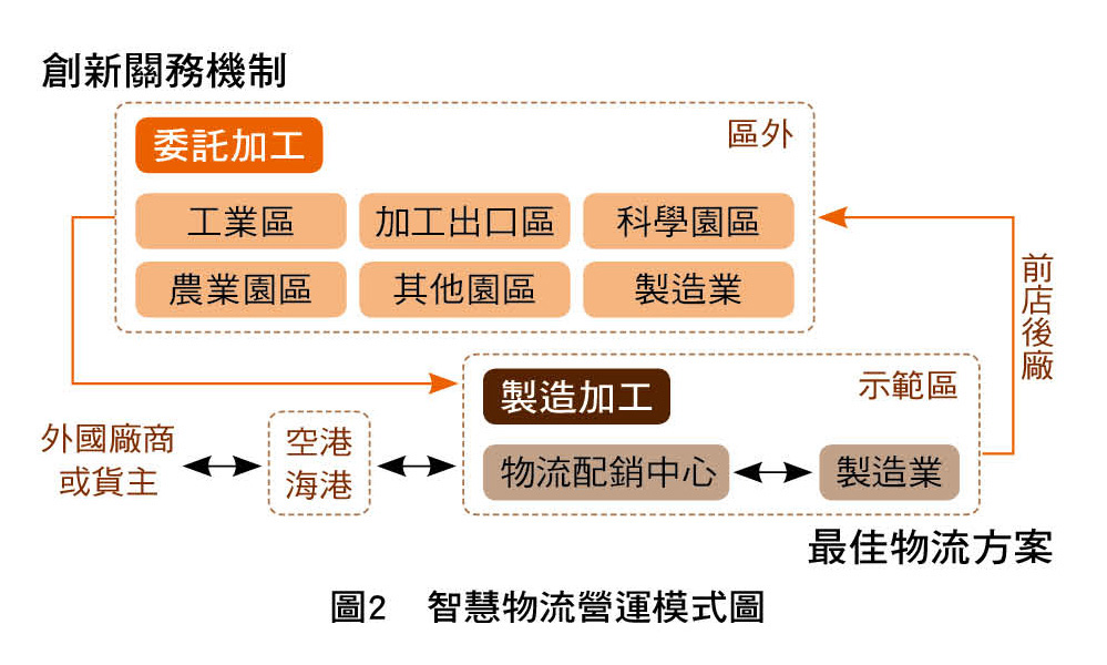 搭配創新關務管理機制,更可擴大「前店後廠」的產業活動範圍。貨品可由示範區之業者(前店)進口後,委託區外業者(後廠)進行更深層次的加工,充分發揮我國在高附加價值產品製造方面的優勢,以整合示範區與其他鄰近園區的資源,提升整體效益。