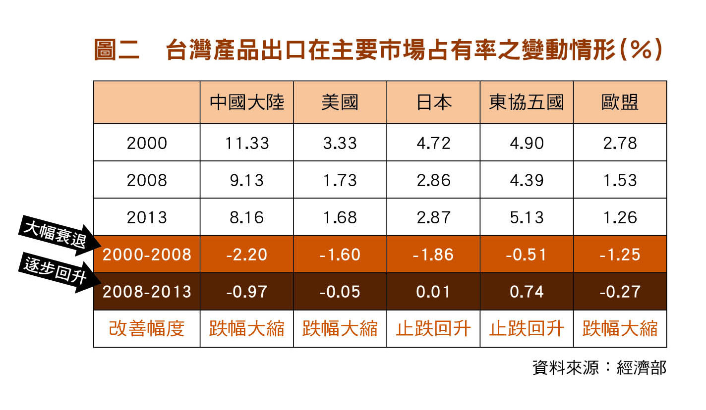 由於當時我國簽訂的自由貿易協定(FTA)很少,在主要出口市場的占有率落後我們競爭對手很多。例如,民國96年韓國與東協自由貿易協定生效後,韓國在東協市占率超過了台灣;101年韓國與美國自由貿易協定生效後,台灣在美國市占率落後韓國的情況開始擴大。