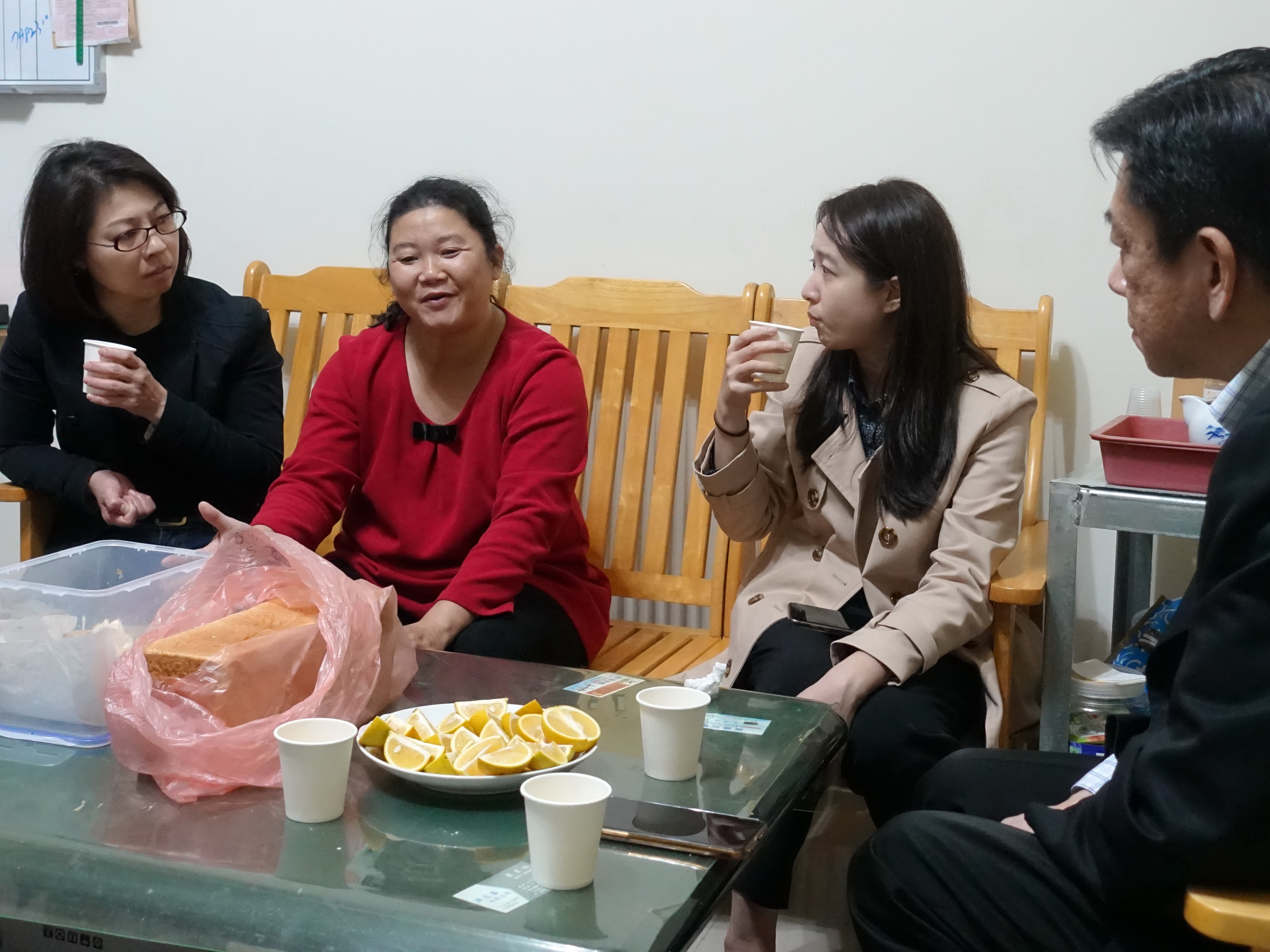 海基會關懷訪視陸配活動今(3)日抵達中臺灣,副秘書長蔡孟君今天與法律處長張峯青等同仁到臺中市與陸配團體負責人餐敘交流,下午赴彰化縣伸港鄉探訪陸配陳女士,關心她的近況,分享生活點滴。