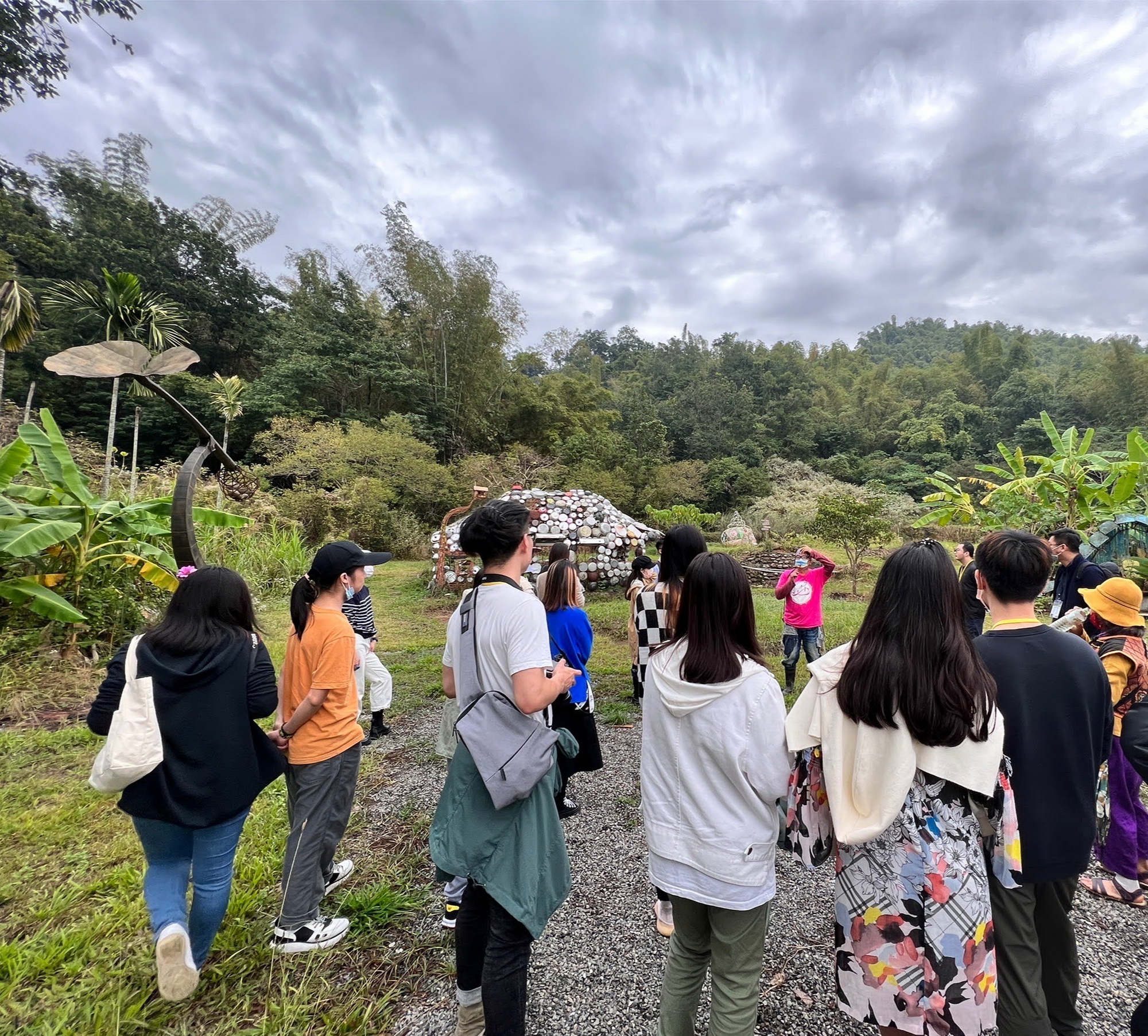 最終站,前往「果然紅」農藝生活,由創辦人羅元鴻先生與蔡佳蓉老師共同導覽農村裝置地景藝術,傳達友善土地的理念、客家六堆文化傳統,並手把手帶領陸生利用稻桿編織出屬於自己的藝術作品。