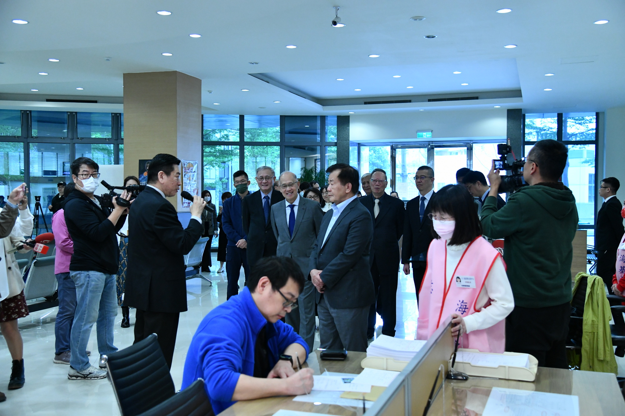 李大維董事長等人在參訪完聯合服務中心後進行合影,並接受媒體訪問。