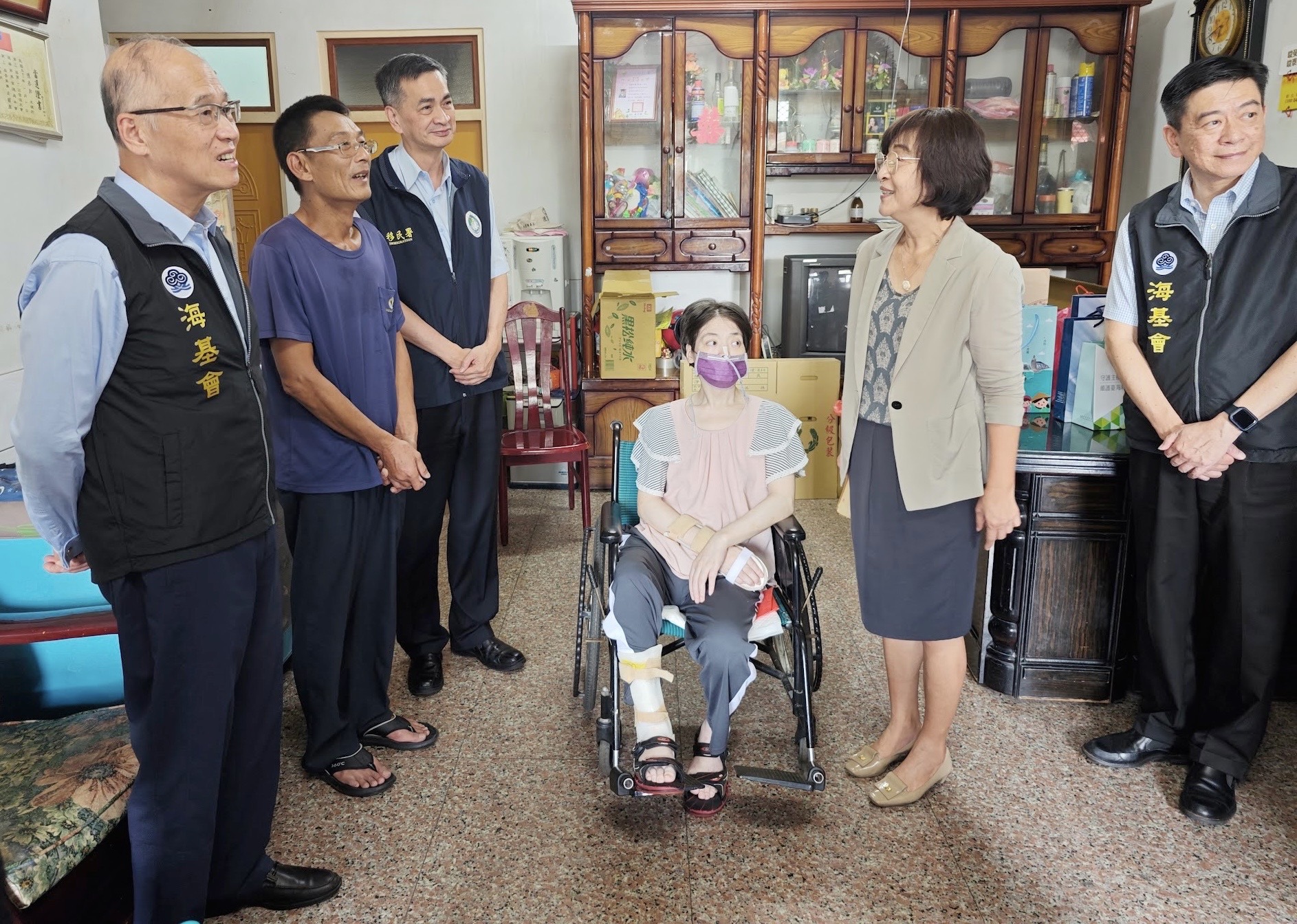 邱垂正秘書長表示,海基會於7月上旬接獲蘇治芬委員辦公室轉介陸配付女士陳情案,陳情人付女士於2011年從四川嫁來雲林縣虎尾鎮,與夫婿陳先生婚後育有兩子,目前持長期居留證。8年前第一次中風,1年多前二度中風,造成行動不便,無法言語,家中經濟全仰賴夫婿陳先生務農維生。邱垂正秘書長立即指示同仁與陳先生聯繫,並會同陸委會及移民署人員前往家中訪視,表達海基會及政府的關懷並詢問協處的需求,陳先生表示,除需撫養年幼子女,也面臨長照費用負擔,讓家中經濟更為窘迫,希望能讓其妻盡早在臺獲得定居許可,以利接受政府長照補助等社會福利。