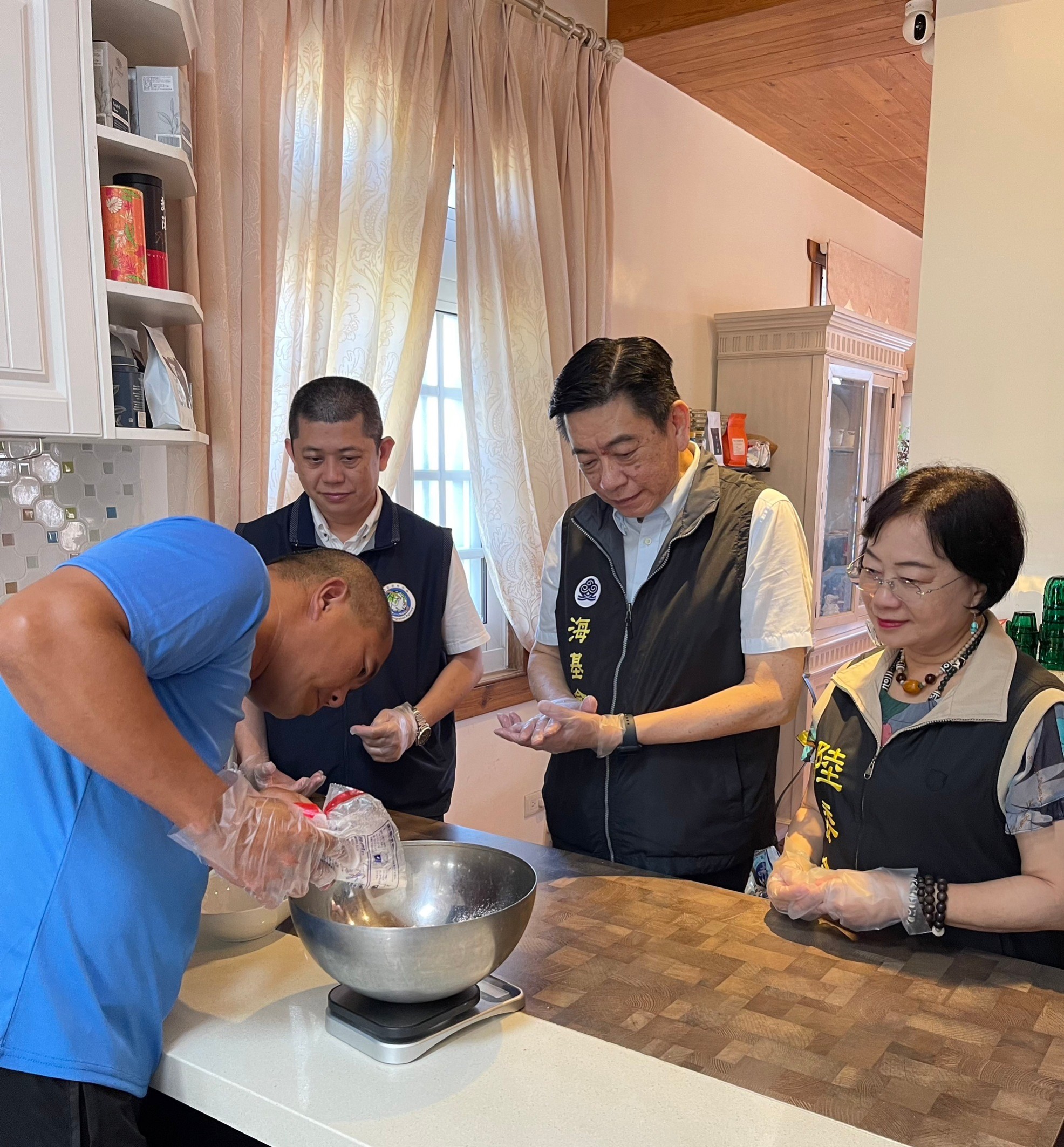 今天上午海基會一行先到陸配李峰經營的「海之風玫瑰莊園」手作法式甜點達克瓦茲,法律處長張峯青、移民署南區事務大隊熊德仁副大隊長加入手作行列,體驗製作甜點的繁瑣過程,陸配邱智芬、港配林秀閑等人參加。中午在烈嶼由重慶覃加銀女士經營的「辣妹子餐廳」餐敘交流,氣氛熱絡。