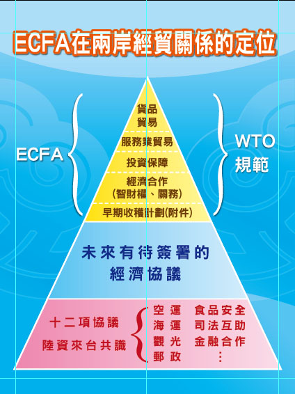 大家都很關心「兩岸經濟合作架構協議」的定位,過去兩會已經簽署12項協議,但大部分跟「三通」有關,後續還有很多協議要進行協商,主要還是跟經濟脫離不了關係。對照圖表所示,ECFA是在三角形的頂端,本次兩會將要簽署的協議只是一個架構,再加上早期收穫當作附件;後續還有三項重要的協議要進行,包括貨品貿易、服務業貿易與投資保障,雙方均同意在ECFA完成簽署並生效後6個月內啟動。