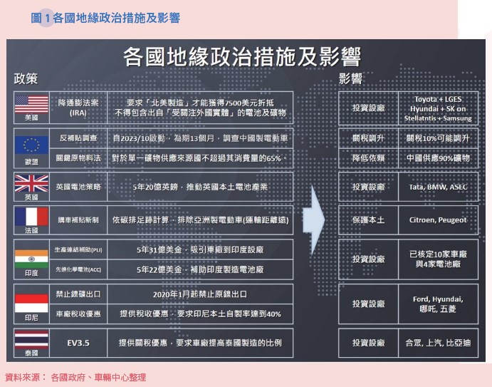 車廠大規模調整和重組供應鏈的布局,是臺灣廠商切入的機會。車廠不但需要新的供應廠商,因「中國加一」策略,不必再擔心來自中國大陸的低價競爭。相較於其他亞洲國家,日本和韓國的汽車供應鏈較為傳統封閉,東南亞國家汽車電子技術相對不成熟。臺灣是3C與消費電子大國,擁有完善的知識產權保護,車廠重視供貨實績(Tesla),也具備軟體開發能力,具有國際競爭力。如果臺廠能夠抓住全球地緣政治的契機,與各國政策相配合,布局生產基地,有機會切入國際車廠的電動車供應鏈。例如鴻海、和碩、友達、和大及富田等臺灣廠商,2023年在美國IRA法案的影響下,已決定赴美設廠就近支援客戶,展現臺灣廠商在地緣政治變局中靈活調整的能力。