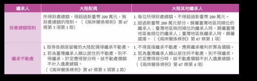 依《兩岸關係條例》第67條規定,分別就大陸配偶、大陸其他繼承人於所得財產總額、繼承不動產設有不同的規定及限制。茲列表說明如下: