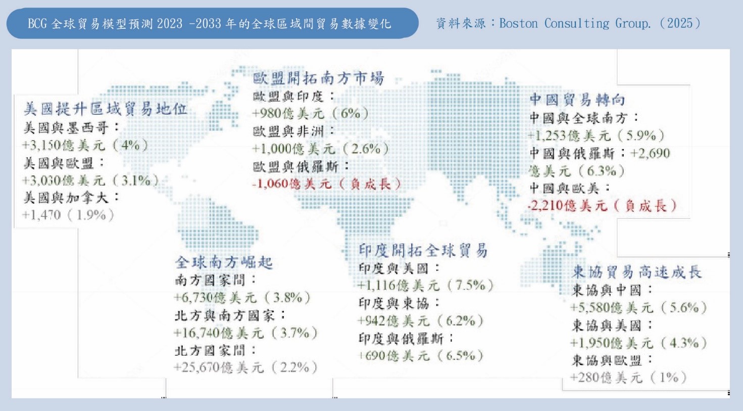 美中地緣政治競爭下,全球供應鏈具體體現「碎片化」與「區域化」趨勢。依據BCG(2025)的預估,2033年之前,全球貿易雖將持續以每年2.9%的幅度成長,但貨物流動方向與路徑卻將出現系統性的轉變。其中,北美、東協與印度等區域將逐漸取代中國大陸,成為全球製造與出口的新核心。北美地區的美墨加貿易預計於2033年前年增逾4%,展現近岸外包(nearshoring)與友岸外包(friendshoring)政策的具體成效。另一方面,中國大陸與西方國家的貿易則呈現下滑趨勢,中國大陸轉而深化與「全球南方」國家的連結,如東協、非洲與拉丁美洲,試圖重建其全球供應網絡主導地位(見下圖)。