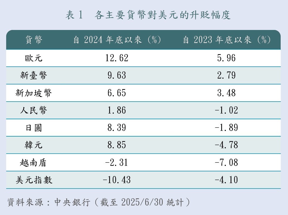 此外,當人民幣走弱時,臺商在當地持有的不動產、生產設備及子公司投資的帳面價值可能出現減損。對於母公司在臺灣的企業,每每臺幣強升,最直接受衝擊的產業為半導體、電子零組件與資通訊、工具機等廠商,金融保險業也難逃巨額匯損命運。今年4月新臺幣仍在33元附近,但因美元資產遭拋售、美元走貶、熱錢流入及出口商拋匯等因素,5月初新臺幣開始急升,單月大漲2.088元、漲幅6.98%,為1989年以來最大單月升幅。進入6月還是升不停,在預期升值的情況下,新臺幣在6月27日以29.140元開出後持續走升,盤中升破29整數關卡,甚至升至28.904,出口商普遍面臨巨額匯損,哀鴻遍野。根據央行統計(如表1),截至6月30日,臺幣自2023年底與2024年初起分別升值2.79%與9.63%,居亞洲貨幣之首。