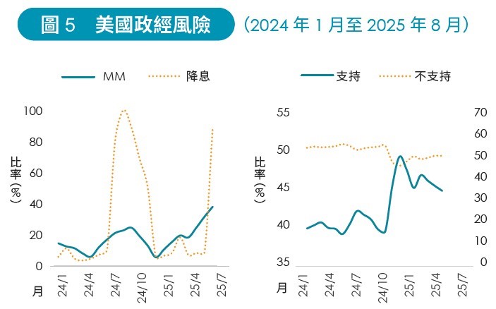 經濟低迷衝擊川普民意。川普施政滿意度由2月的高峰(49.7%),持續下探到8月的45.1%。3月支持度已呈現死亡差交,且差距持續擴大到8月的6.7個百分點,隱含民眾不滿對等關稅的負面衝擊。(見圖5)