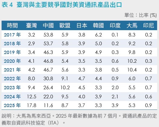 前7個月,臺灣對美資通訊產品出口815萬美元,占美相關商品進口的17.8%,居主要競爭國之冠,此部分係受《資訊科技協定》(Information Technology Agreement, ITA)的零關稅保障。其次是中國大陸,占比為11.6%。其餘6國的占比,皆低於一成。(見表4)
