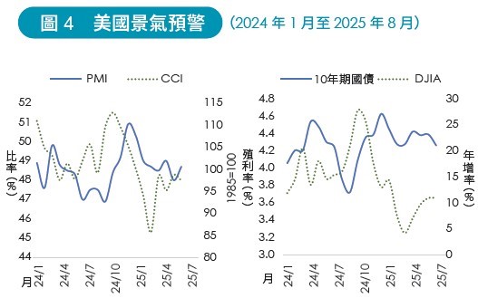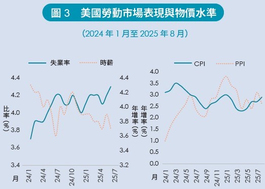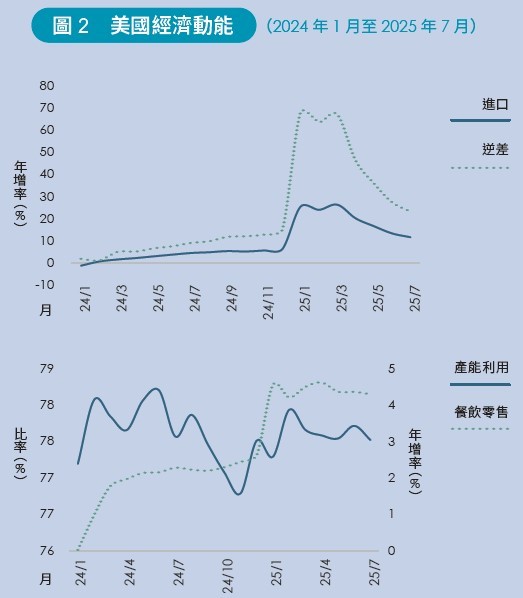 對等關稅亦衝擊美國內需動能。前7個月,餐飲零售銷售額年增4.3%,連續3個月減緩。消費疲軟又削弱投資意願。7月工業產能利用率僅77.5%,低於80.0%的長期趨勢線,凸顯企業經營愈趨保守。(見圖2)