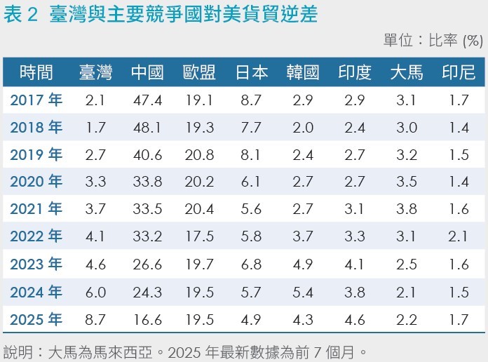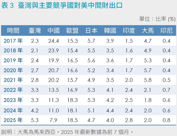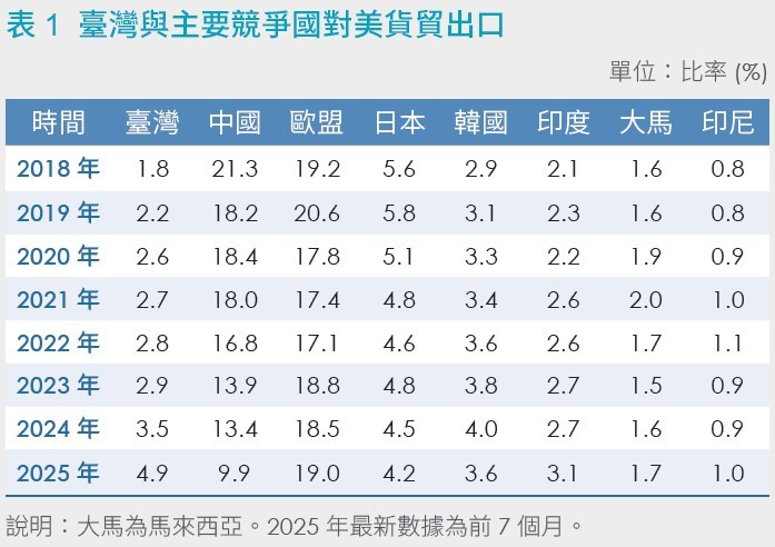 2025年前7個月,臺灣對美貨貿出口1,032億美元,占美進口總額的4.9%,較2018年美中關稅戰爆發初期上升3.1個百分點,居主要競爭國之冠。印度、韓國、馬來西亞與印尼亦有所成長。中國大陸、日本與歐盟則同步衰退。(見表1)