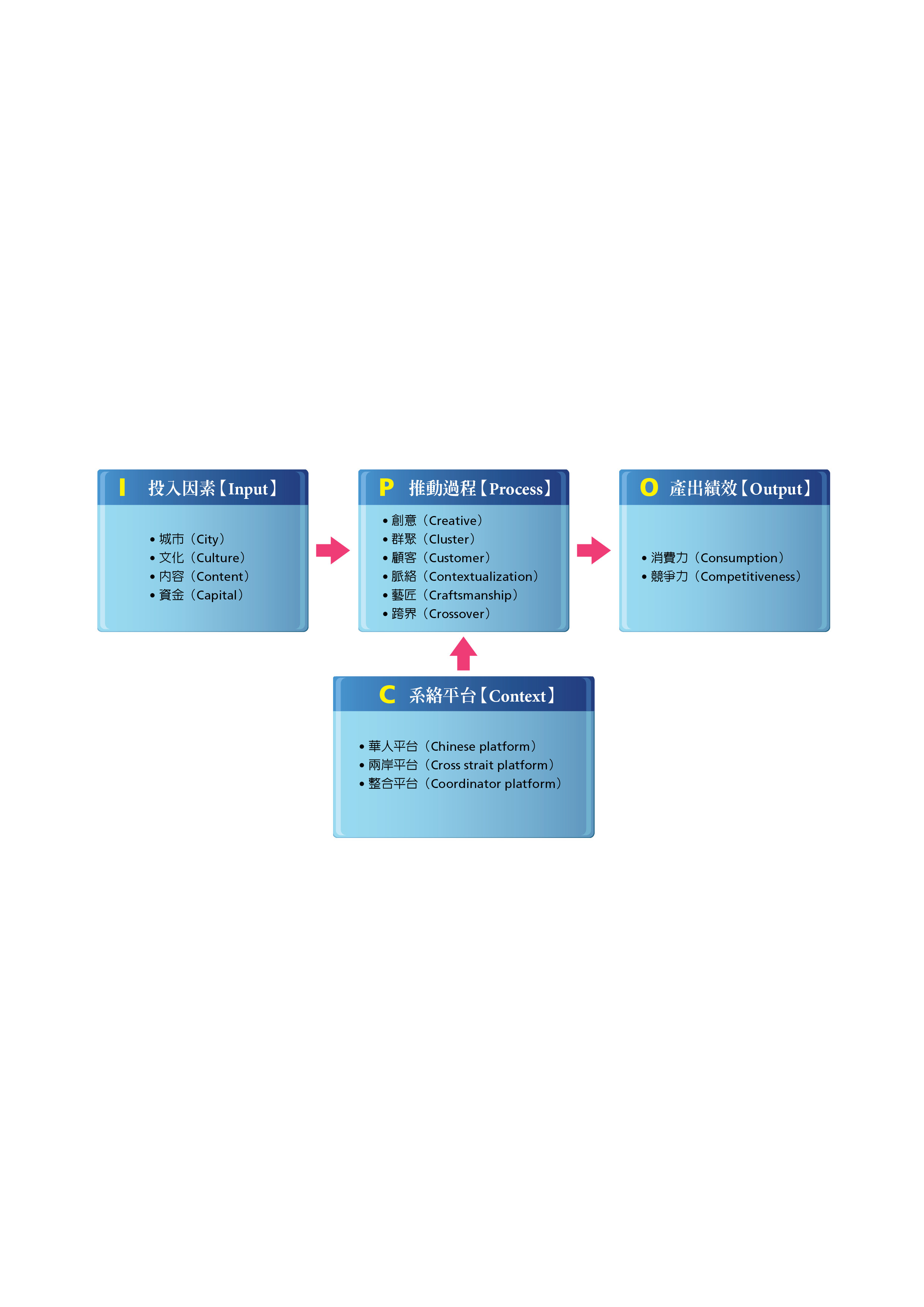 「文化是城市之根,创意是城市之魂」,文化创意城市将成为二十一世纪新显学,依前述系络平台、投入因素、推动过程及产出绩效等「15C」构成的推动构思(如图所示),希冀成为两岸推动文创产业的参考。