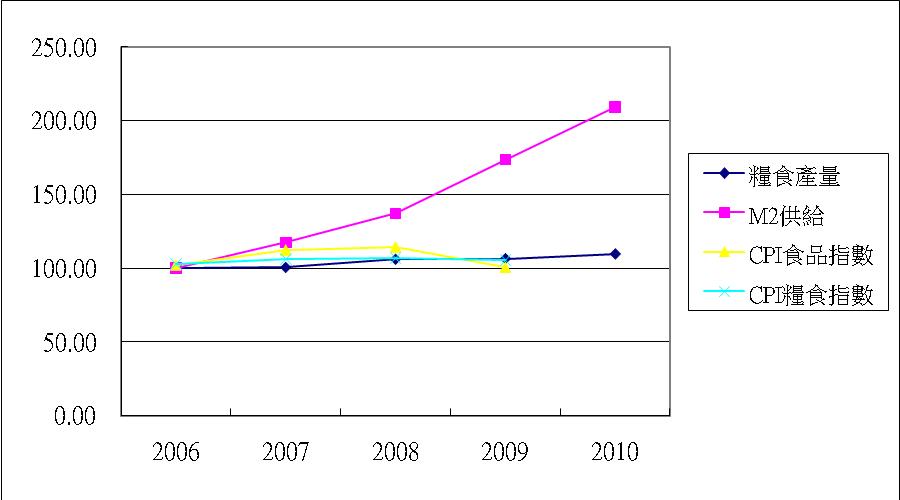 首先我们可以尝试厘清,大陆货币政策是否会影响食品价格。从图一中可观察到,代表大陆货币政策的M2供给指数变化,与食品物价变化之间的关系并不显著。这代表最近某些针对物价上涨的讨论中,将原罪归给人民银行货币政策的说法并不正确。若直接观察主要食品类的供给状况,可以发现除了今年第一季旱灾对大陆小麦等作物稍有影响之外,其余粮食类、蔬菜类的耕作面积均呈现小幅成长,此外大陆国务院总理温家宝在三月的国务院常务会议中,也表示将展开全国粮食稳定增产行动,针对玉米与梗稻等项目增加生产,以确保市场供应与物价稳定。显示过去一段时间的食物类产品价格上涨,有部分原因来是直接来自于供给相对不足的因素,其次才可能是来自于热钱因素导致的进口大宗物资价格上涨,以及若干项目存在的国内炒作。