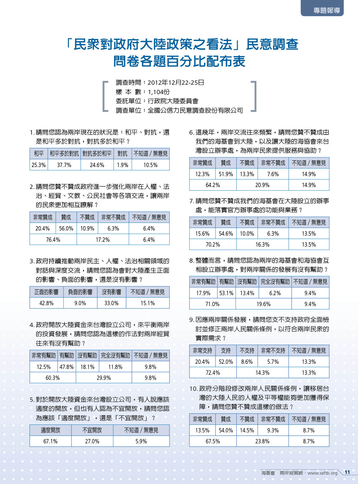 行政院大陆委员会2013年1月3日公布最新专案民调,对于政府优先推动的三大重点工作,包括「扩大与深化两岸各层面的交流」、「推动两岸两会互设办事机构」以及「通盘检讨修正两岸人民关系条例」,国内民意多表肯定与支持。