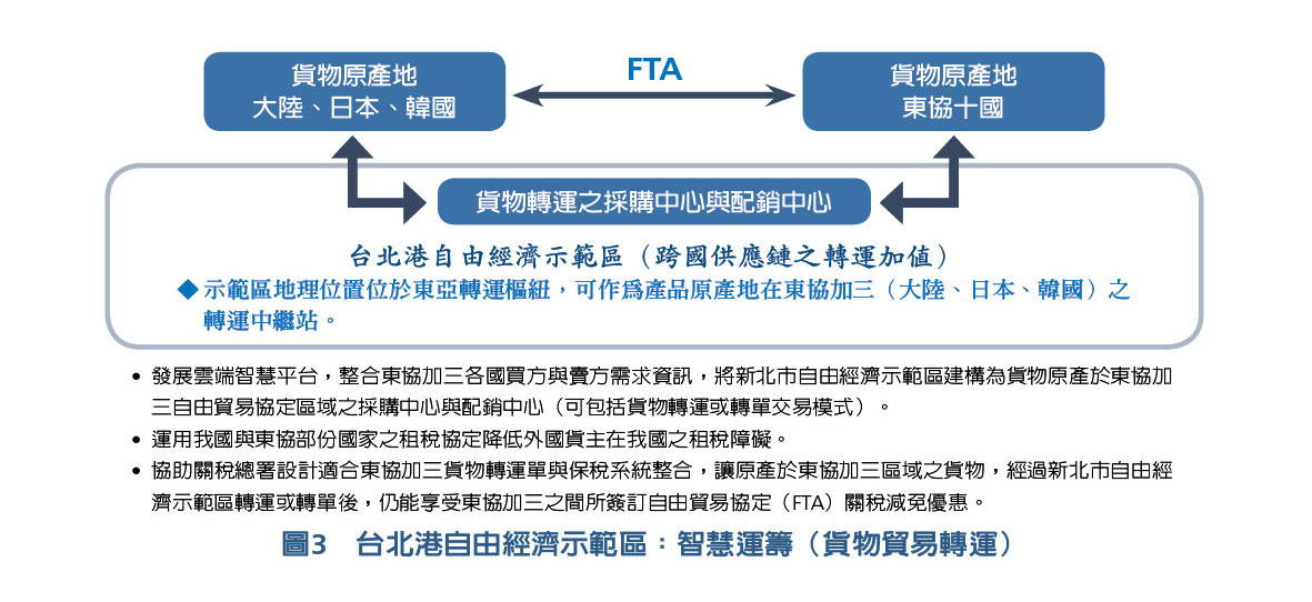 就六港一空而言,以海港、空运的结合,前店后厂设计,扩大过去自由贸易港区的浅层加工,提升至深层加工,并纳入智慧运筹,更使制造和下游的物流运筹连成一气,有效的延伸价值链,创造更大的附加价值,使「示范区」内可以从上游的研发、设计,到中游的制造,下游的通路贯穿一气,提供一步到位服务,有助于吸引台商、外商投资,提升经济动能。