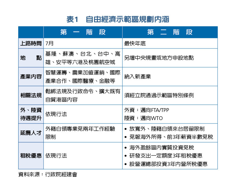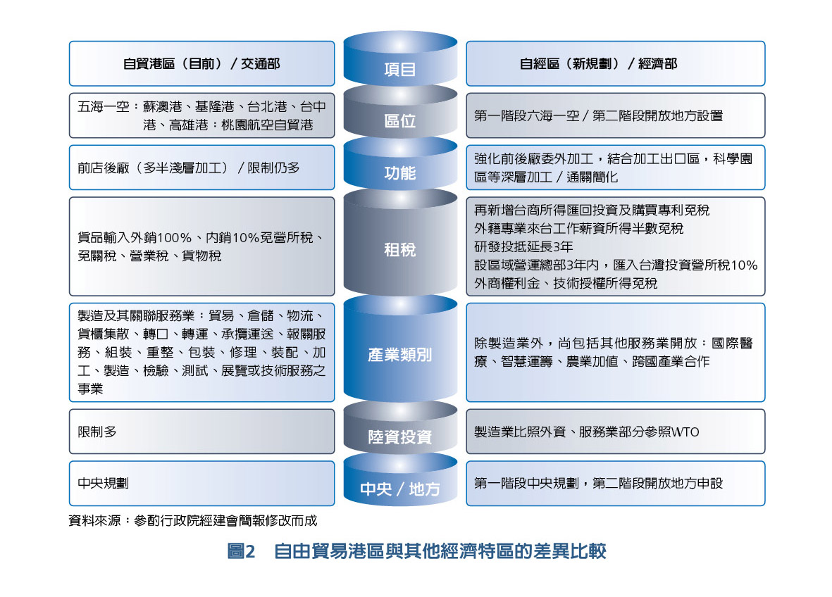 首先,「自经区」分为二阶段,除第一阶段的中央政府规划外,第二阶段将开放地方政府申请。其次,在功能上,目前的自贸港区虽有前店后厂功能,但祇有浅层加工,而「自经区」则强化委外功能,并结合通关的简化来扩大深层加工,创造更大的附加价值。第三,在租税优惠上,除了自贸港区的零关税、营业税之外,「自经区」汇回投资及购买国外专利免税,外籍白领专业人士前3年薪资减半课综所税,同时,研发抵减由目前的1年延长至3年扣抵。此外,营运总部汇回台湾投资营所税祇课10%,以及外商权利金、技术授权免税。第四,在产业类别上,自贸港区以制造及其关联服务业为主,「自经区」则包括了服务业的开放、示范。第五,在陆资投资上,陆人投资时,制造业比照外资,服务业部分则参照WTO。第六,中央/地方职权上,自贸港区完全由中央规划,「自经区」则在第二阶段开放地方申设(见图2)。