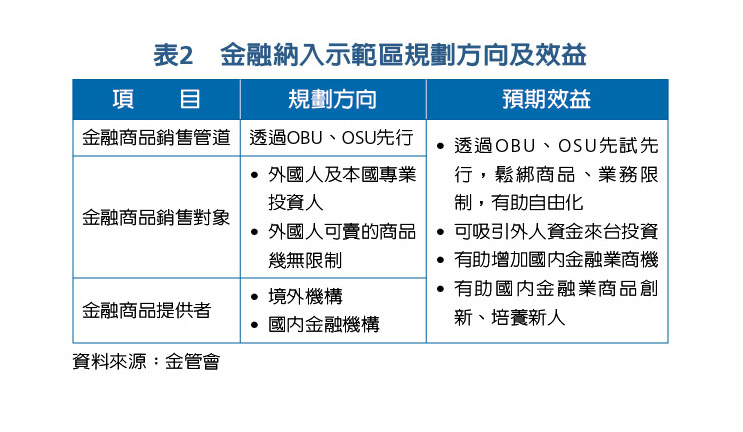 至于金融业上,金融业纳入自由经济示范区将采双轨并进,包括投资大陆股市逾30%的境外基金,以及国内投信发行的投资台股外币计价基金,未来都可在国际金融业务分行(OBU)、国际证券业务分公司(OSU)销售,有助吸引外国人及大陆投资人,金融业商机将大增。(见表2)