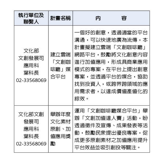 3. 建立云端「文创咖啡厅」媒合平台,鼓励价值产值化。建构一个媒合创意的平台,此平台让有创意却无创业模式也无资金者,可以利用此平台将创意提出,然后透过平台将创意转化为商业模式;或是有创意内容亦有商业模式的人,亦可以上云端「文创咖啡厅」找资金;以及有资金但苦无内容者,则可以上平台找内容。