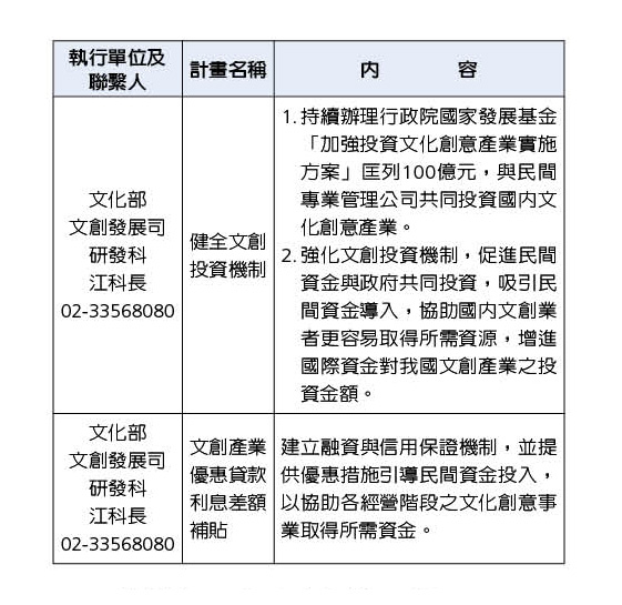 1. 促进文化创意产业之发展及公有文化创意资产流通及再利用,鼓励政府与民间共同合作,充分开发、运用图书、史料、典藏文物或影音资料公有文化创意资产。例如公广集团(公视基金会、中华电视公司等)累积了庞大资源及其报导的图文、影像等素材,如能活络运用相关智慧财产,将可衍生周边广大效益。