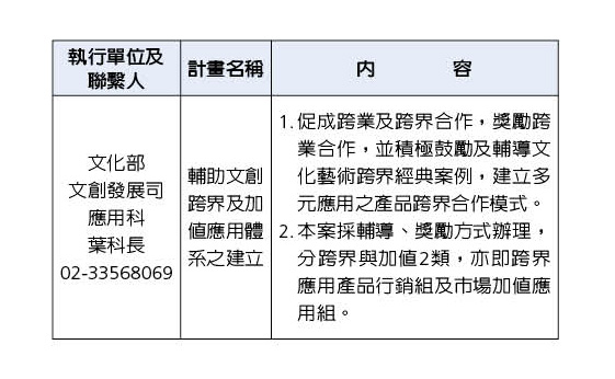 1. 促进文化价值与内容透过创意加值与智慧财产授权机制,转换成行销全球的经济产值,例如促成高科技产业品牌行销与文化元素结合。