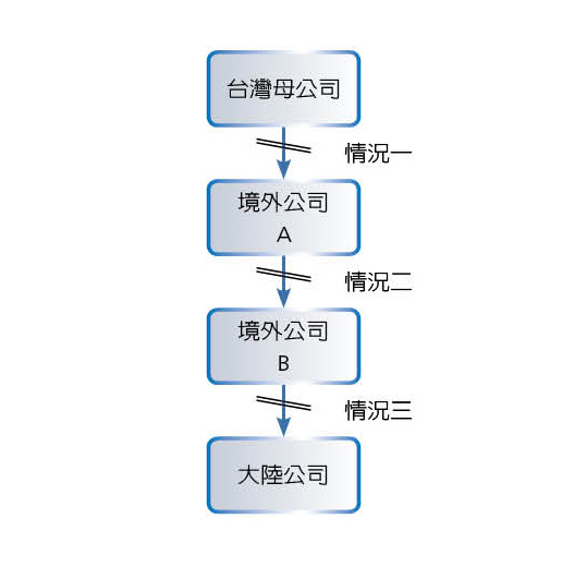 再者,现行大陆法令规定无论直接或间接转让大陆公司股权所获取之资本利得皆需于大陆缴纳企业所得税(假设间接股权转让大陆公司不具合理商业目的)。然若配合台湾的实际管理处所规定及未来两岸租税协议,转让大陆公司的课税权将可能归属于台湾税局,最终结果将与现行状况不同。以图二为例,情况一若境外公司A被认定为台湾的实际管理处所,台湾公司处分境外公司A的股权转让行为将成为台湾公司处分台湾公司的国内法行为。大陆端税局将无698号文申报的的义务,及未来衍生重复课税的风险;情况二下,若境外公司A与B均被认定为台湾的实际管理处所,则境外公司A处分境外公司B的股转行为也能得到情况一的好处;情况三若境外公司B被认定为台湾的实际管理处所,境外公司B直接处分大陆公司,也有机会享受两岸租税协议,就大陆端已扣缴的税款回台湾抵扣(目前法令下,情况三转让时大陆端已扣缴税款无法回台抵扣)。