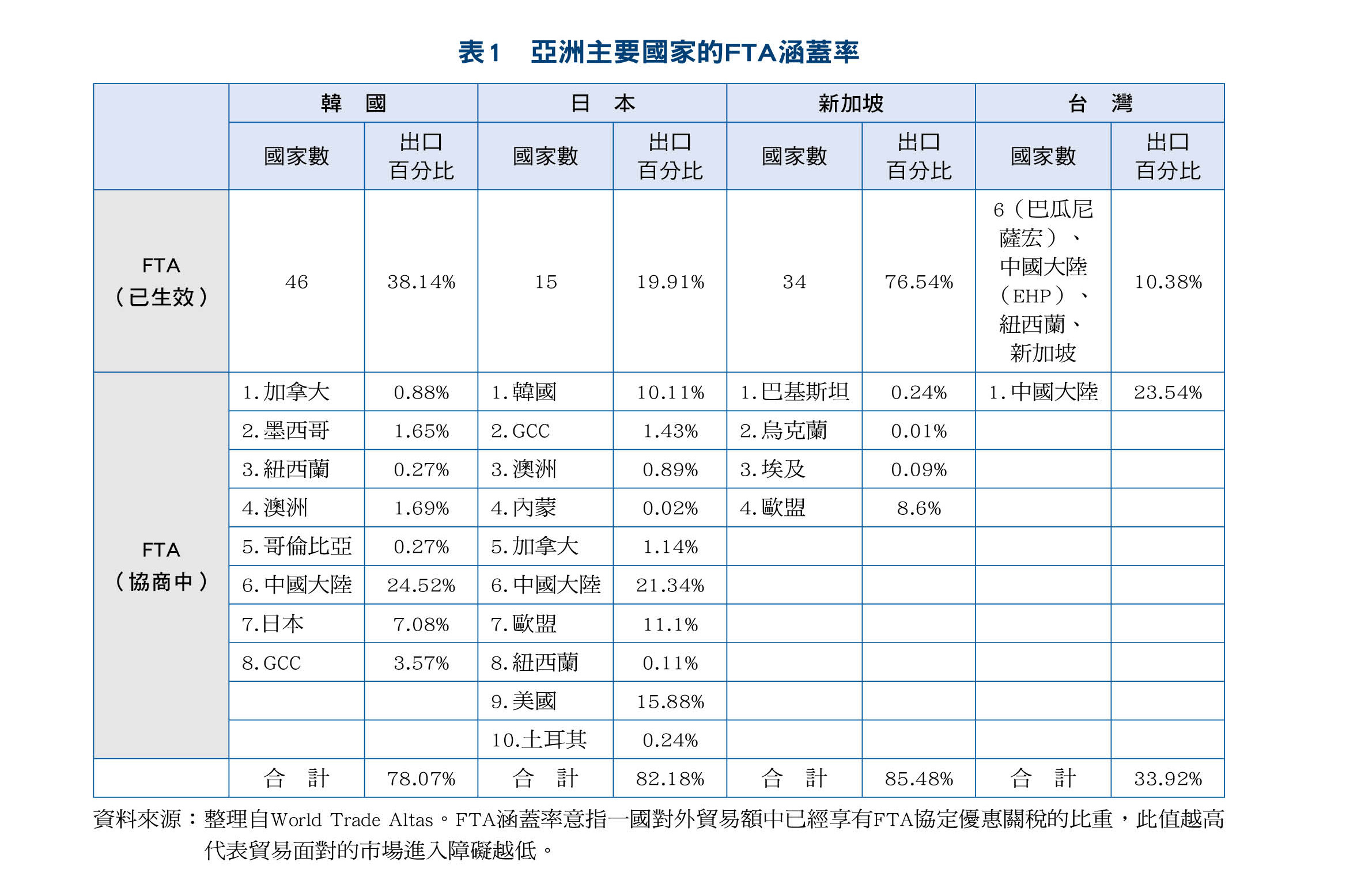 一个国家参与区域经济整合(FTA)所享有的关税优惠优势多寡,可由其对外贸易中有多少贸易比重系受FTA优惠关税待遇所囊括,此既FTA涵盖率。则由表1可看到就已生效的FTA分析,相对于同属亚洲之新加坡、韩国、日本而言,台湾的FTA涵盖率明显偏低,台湾每出口100美元仅10.38元可享受到FTA优惠关税,而新加坡、韩国、日本每出口100美元,分别可有76.54元、38.14元、和19.91元享受到FTA优惠关税,FTA涵盖率偏低已使台湾在国际经贸环境中,居于不利的竞争地位,尤其是韩国签署FTA的影响更是严重。此影响不仅是居于非优惠关税进入的劣势,更将衍生到产业链分工布局的改变,即便参与区域经济整合态度保守的日本,也转而积极参与TPP与RCEP,争取市场进入障碍削减或排除的优惠待遇及商机。
