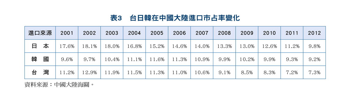 就个别国家来看,日本、台湾及韩国是大陆的前三大进口来源国,2001年在大陆进口市场的市占率分别为17.6%、11.2%及9.60%。2002年之后,日本及台湾在大陆的市占率逐年下滑,日本由18.11%下降至9.78%,减少8.33个百分点;台湾则由12.90%下滑至7.27%,减少5.63个百分点。而韩国在大陆的市占率迟至2005年后才开始下滑,且下滑幅度明显小于日本和台湾。2012年,韩国在大陆的市占率为9.17%,不仅超越台湾,且逐渐逼近日本(表3)。显示台湾在大陆市场亦面临韩国的高度竞争。