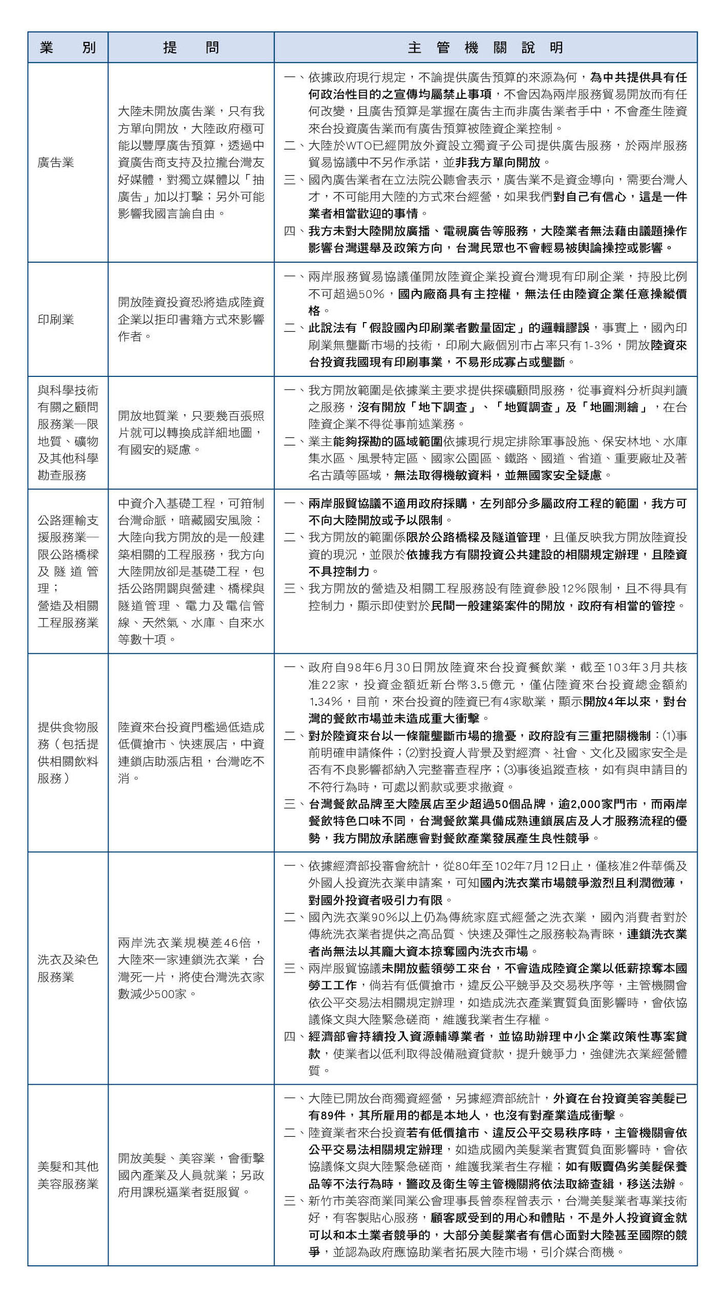 问7:外界关心个别产业开放内容与主管机关的说明(详如附表)