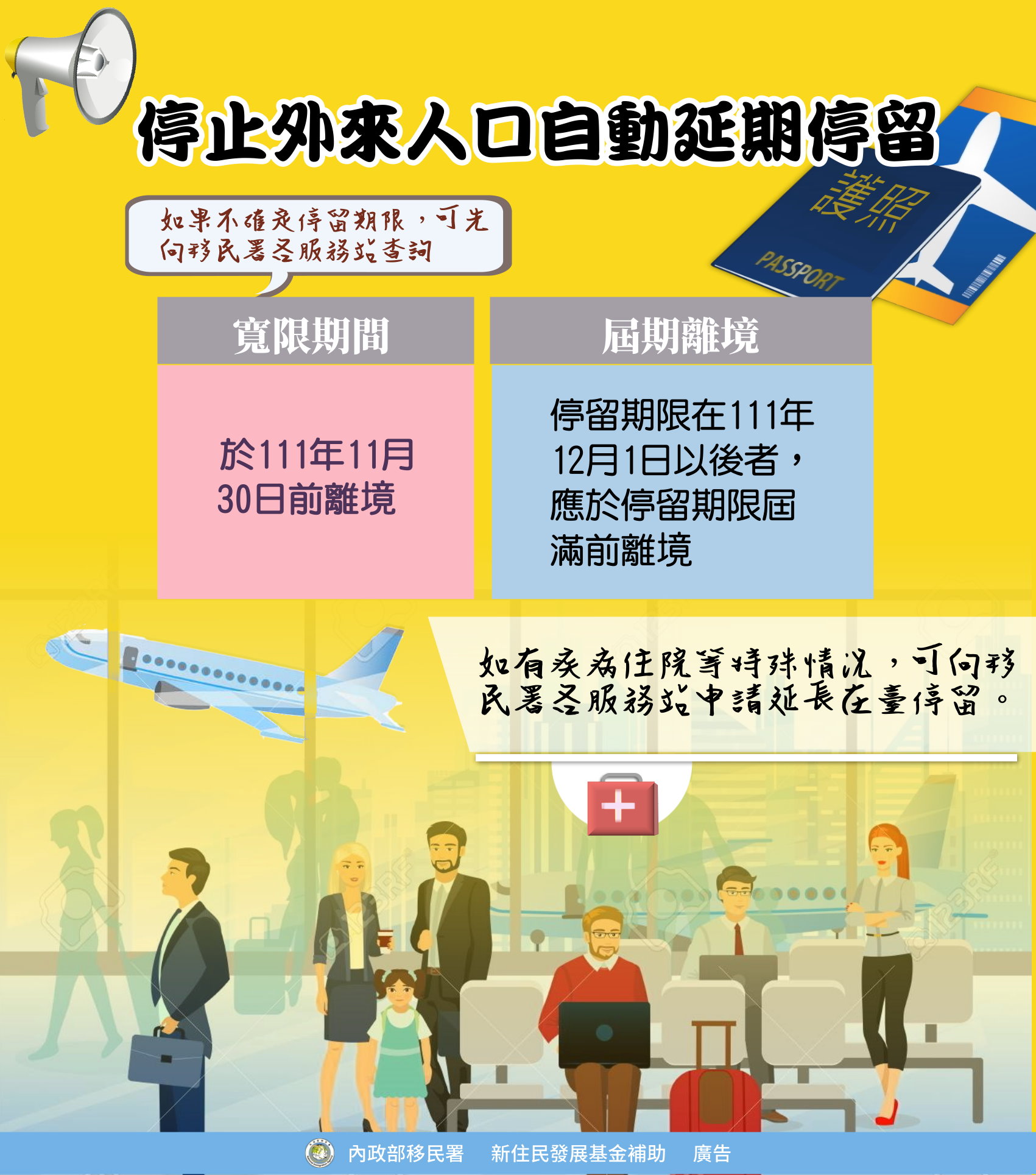 移民署表示,未来不再给予自动延长停留期限,请当事人于届期前离境,但为了让外来人口安排离境规划及行程,将给予一段宽限期,自动延长停留期限措施适用对象的停留期限于111年11月30日前到期者,请于111年11月30日前离境;停留期限于111年12月1日(含)后者,请于自动延期后的合法停留期限届满日前离境;另提醒外来人口,若不确定停留期限,可于出境前先至移民署各直辖市、县(市)服务站确认。