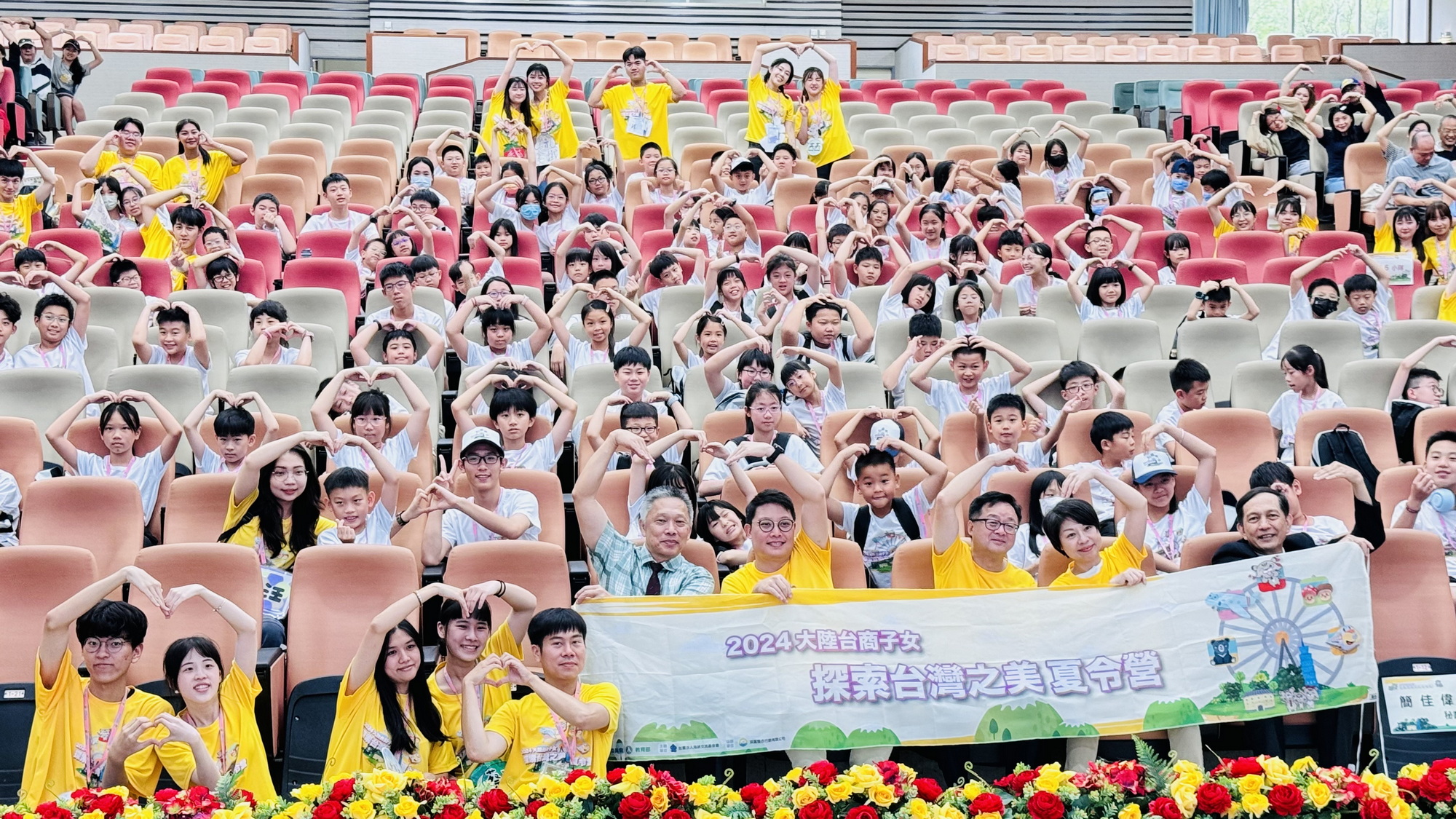 活动现场除了辅导员们创新创意的队呼及自我介绍,更有台味十足的创意问答游戏,让学员们兴奋抢答,海基会罗秘书长及蔡副秘书长也纷纷举手呼应,与家长及学员们互动十足,场面欢乐逗趣。最后,由值星官带领全场学员们举手宣示,正式开始本梯次营队活动。