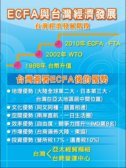 签署ECFA后,台湾在中国大陆能有和东协国家公平竞争的机会,对日本与韩国也有捷足先登的机会。台湾拥有众多优势,包括地理优势、文化优势、空间优势、效率优势、市场优势与投资优势等,两岸签署ECFA后,对台湾进一步升级转型,再创高峰,达成亚太营运枢纽以及台商营运中心的目标,应该是很好的机会。