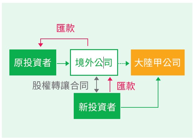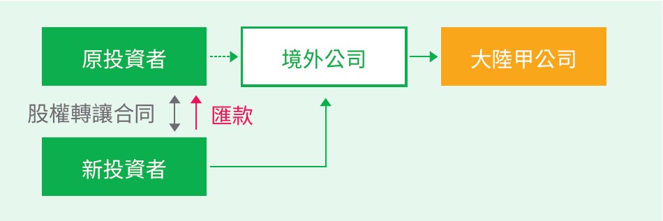 新投资者与境外公司签订股权转让合同,由新投资者支付转让价金至境外公司,境外公司再将资金汇回原投资者。