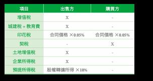 卖方必须缴纳增值税,城市维护建设税及教育费附加之课税基础为增值税额。买卖双方都须缴印花税,买方房地产契税的税基是合同价格。土地增值税是房地产实价的增值额,乘以30%~60%的税率;另尚须缴纳所得税,以及盈余分配之预提所得税(如下表)。