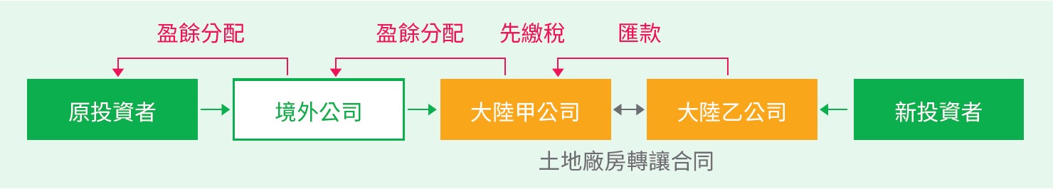 卖方是原投资者透过境外公司控股原持有土地厂房的大陆甲公司,买方是新投资者控股的大陆乙公司。买卖双方签订土地厂房转让合同,金流从乙公司到甲公司,甲公司要先缴纳前述税金后,盈余分配到境外公司,再分配到投资者。